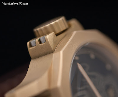 Die Kronenwächter sind mit vier großen Schrauben tatsächlich auf dem Gehäuse befestigt, während die Krone nicht verschraubt wird - eine große Bequemlichkeit für eine handgewickelte Uhr mit einer zweitägigen Gangreserve. Wasser-Widerstand ist eine beruhigende 100 m, dank drei Dichtungen in der Krone und Rohr.