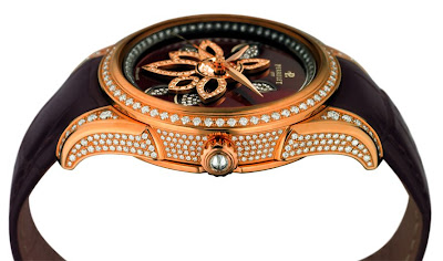 Die Erben von Perrelet wagten, basierend auf dem patentierten Double Rotor, eine patentierte Komplikation, ein kühnes Setting. Diamanten, Rubine, Saphire oder Smaragde gehen über die einfache Verwandlung einer Uhr mit weiblichen Juwelen hinaus. Der sichtbare Rotor auf dem mit Lotusblüten gestalteten Zifferblatt ist verbunden und perfekt mit dem oszillierenden Gewicht synchronisiert und liefert dem Wickelmechanismus zusätzliche Energie. Jede Frau belebt ihre Uhr durch ihre eigenen Bewegungen.